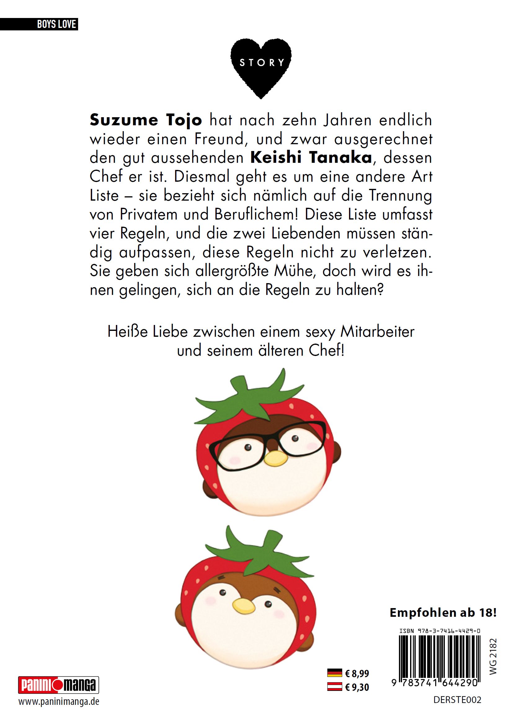 Feinste Boys-Love-Comedy mit einem feinen Hauch Sexyness über das Älterwerden und den Mut, neue Erfahrungen zu machen.Werde Teil einer heißen als auch humorvollen Liebesgeschichte zwischen zwei Männern, wo fader Alltag auf heiße Spontanität trifft!Das erwartet dich in Band 2: Suzume Tojo hat nach zehn Jahren endlich wieder einen Freund, und zwar ausgerechnet den gut aussehenden Keishi Tanaka, dessen Chef er ist. Diesmal geht es um eine andere Art Liste – sie bezieht sich nämlich auf die Trennung von Privatem und Beruflichem! Diese Liste umfasst vier Regeln, und die zwei Liebenden müssen ständig aufpassen, diese Regeln nicht zu verletzen. Sie geben sich allergrößte Mühe, doch wird es ihnen gelingen, sich an die Regeln zu halten? Heiße Liebe zwischen einem sexy Mitarbeiter und seinem älteren Chef! Für Fans von Boys Love-, Comedy- und Romance-Manga!Empfohlen ab 18!