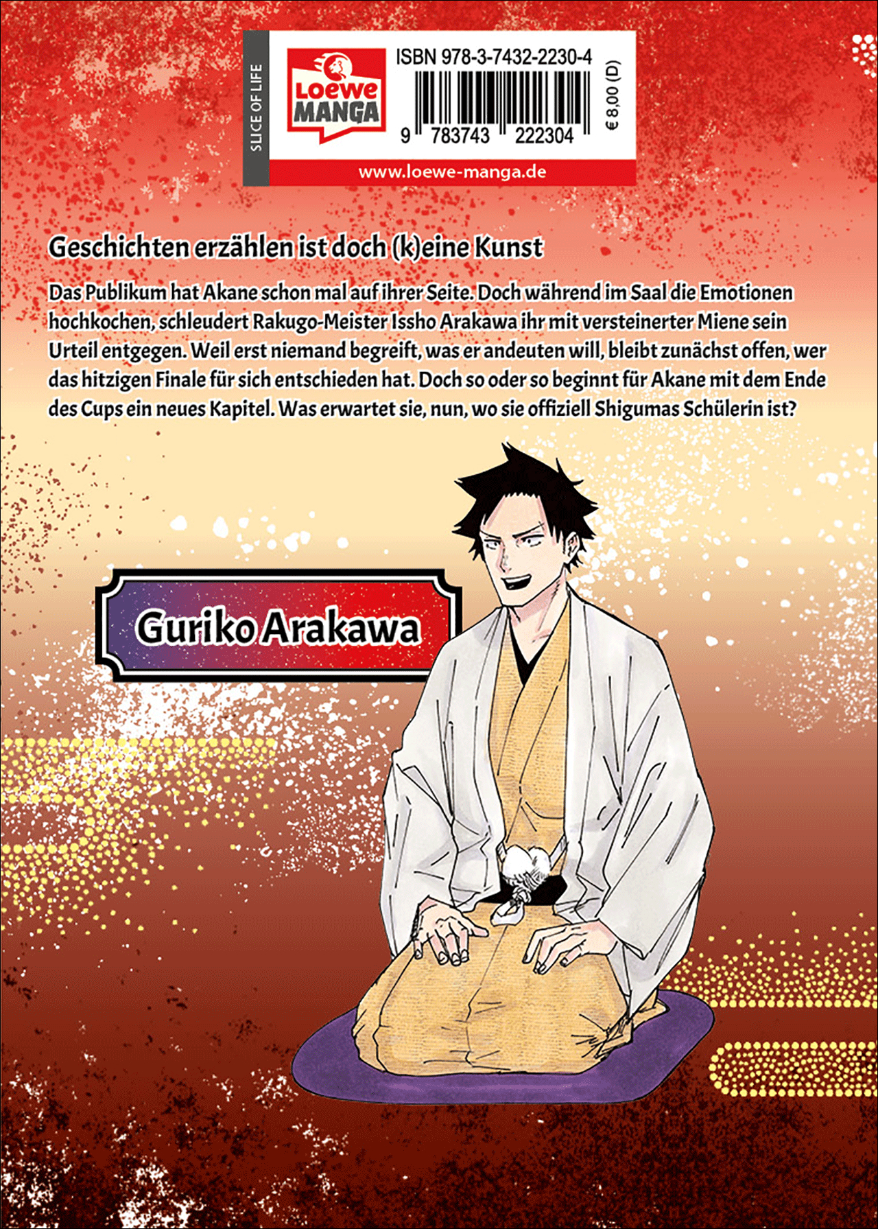 Das Publikum hat Akane schon mal auf ihrer Seite. Doch während im Saal die Emotionen hochkochen, schleudert Rakugo-Meister Issho Arakawa ihr mit versteinerter Miene sein Urteil entgegen. Weil erst niemand begreift, was er andeuten will, bleibt zunächst offen, wer das hitzigen Finale für sich entschieden hat. Doch so oder so beginnt für Akane mit dem Ende des Cups ein neues Kapitel. Was erwartet sie, nun, wo sie offiziell Shigumas Schülerin ist?