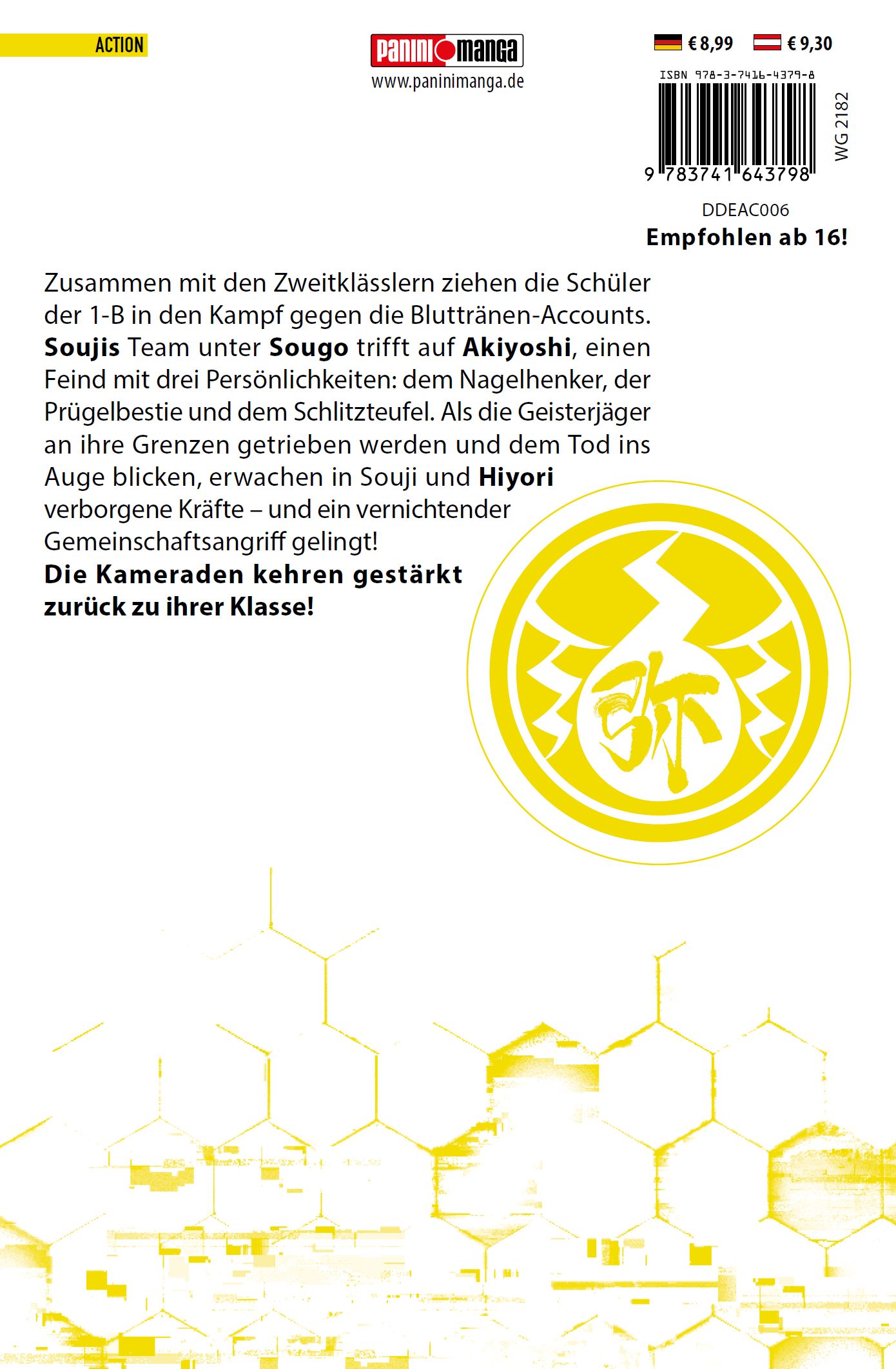 Die Geister von heute hausen in Smartphones! Vielleicht auch in deinem … Streitlustig und zerstörungsfreudig: Das ist der 15-jährige Souji Enishiro, besser bekannt als „Aoringo“, ein berüchtigter Streamer, der durch schockierende Videos Geld scheffelt. Für die Gesellschaft ist er die reinste Plage, aber in Wirklichkeit ist er ein herzensguter Junge, der seine Schwester Akari und Süßigkeiten über alles liebt. Seine Skandalvideos dienen nur dazu, die teuren Behandlungskosten seiner kranken Schwester zu decken. Solange sie gesund ist, ist Souji glücklich – selbst wenn die ganze Welt ihn hasst. Doch dann widerfährt Akari ein Unglück … Das erwartet dich in Band 6:Zusammen mit den Zweitklässlern ziehen die Schüler der 1-B in den Kampf gegen die Bluttränen-Accounts. Soujis Team unter Sougo trifft auf Akiyoshi, einen Feind mit drei Persönlichkeiten: dem Nagelhenker, der Prügelbestie und dem Schlitzteufel. Als die Geisterjäger an ihre Grenzen getrieben werden und dem Tod ins Auge blicken, erwachen in Souji und Hiyori verborgene Kräfte – und ein vernichtender Gemeinschaftsangriff gelingt! Die Kameraden kehren gestärkt zurück zu ihrer Klasse!Die Mission lautet: Vertreibe die digitalen Geister in diesem Schul-Geister-Battle-Fantasy-Manga!