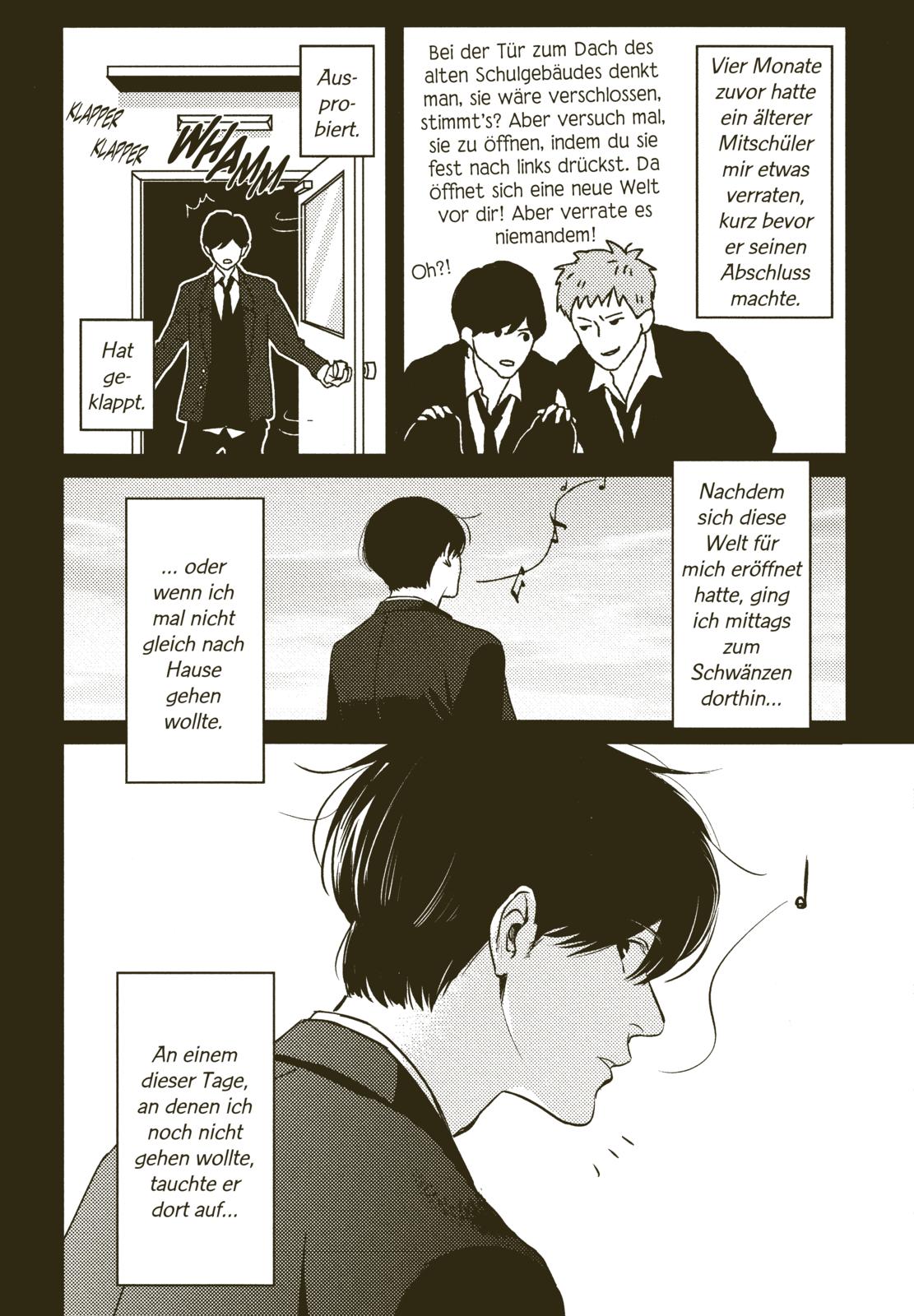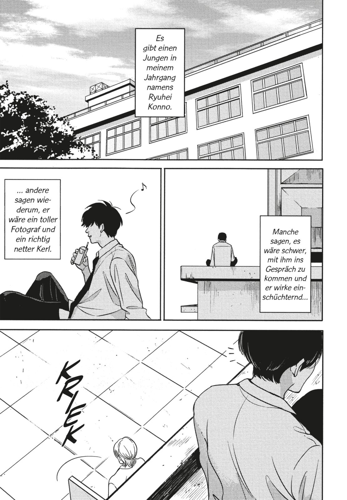 Shuichiro zieht es vor, sich nach dem Unterricht aufs Dach der Schule zurückzuziehen und sich vor seinen Problemen und seinem Zuhause zu verstecken. Eines Tages trifft er dort Konno, den viele für arrogant und unnahbar halten. Doch schnell stellt sich heraus, dass dieser einfach nur seine Leidenschaft Fotografieren liebt und keinen hat, der sein Streben nach dem Ausdruck im perfekten Bild versteht. Zwei sensible Geister treffen mit den beiden aufeinander... wird Konno es schaffen, dass Shuichiro wieder zu seiner Leidenschaft Musik zurückfindet und dem gequälten Jungen ein Lächeln ins Gesicht zaubern? Ein hochgelobtes Boys-Love-Drama um zwei empfindsame Jungs, die ihre Liebe zum Leben wiederfinden.
