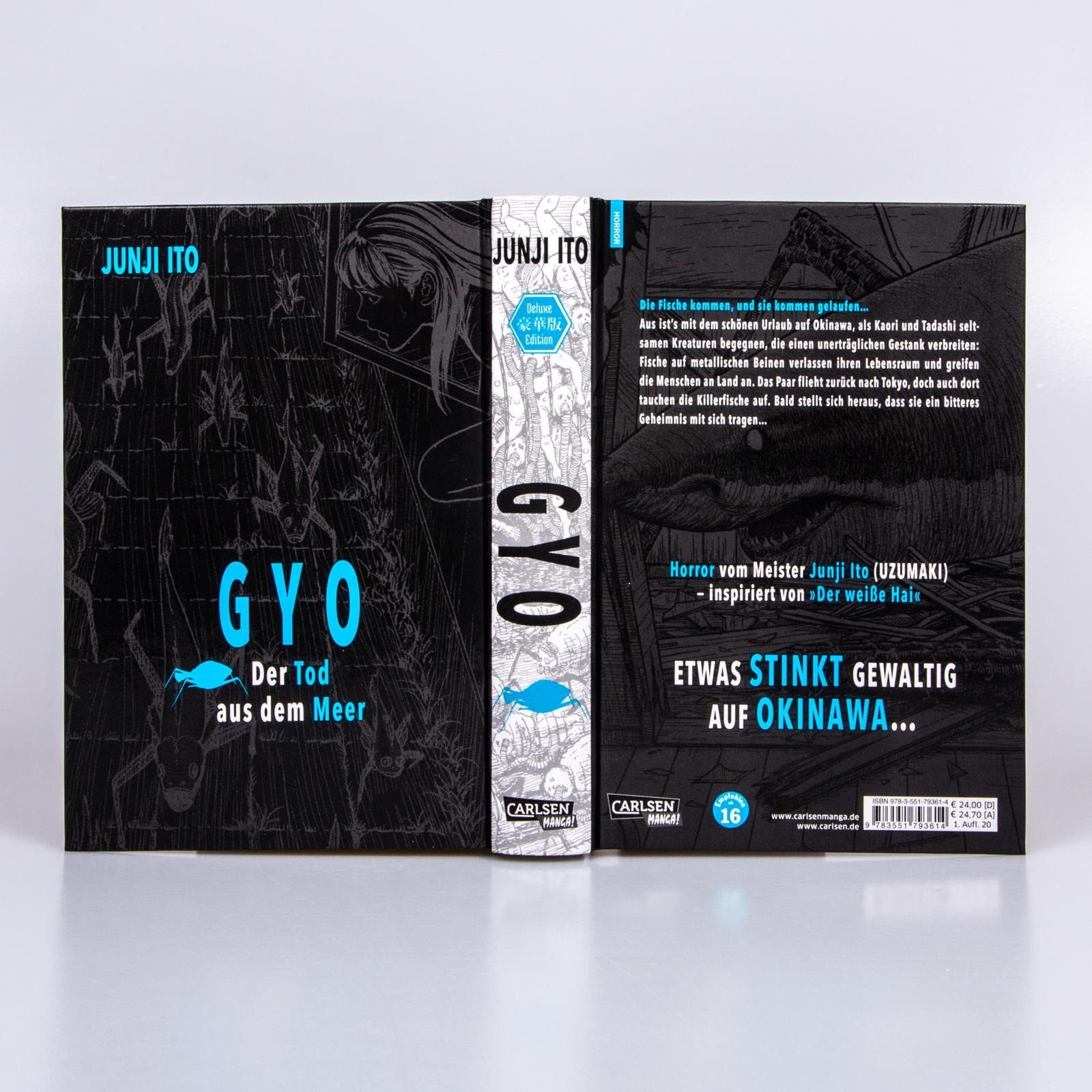 Als aus dem Meer tote Fische auf Metallbeinen auftauchen und an Land Angst und Schrecken verbreiten, nimmt eine Katastrophe ungeahnten Ausmaßes ihren Lauf. Mitten hineingezogen in den übernatürlichen Horror wird ein junges Paar. Besonders Kaori reagiert auf den unerträglichen Gestank, der sich über die Insel legt und wird Opfer der mysteriösen Invasion. Verzweifelt versucht Tadashi seiner Freundin zu helfen und gerät an einen wahnsinnigen Wissenschaftler, in dessen Vergangenheit die Quelle des Bösen zu liegen scheint... Nach dem Meisterwerk UZUMAKI folgt mit GYO ein weiteres Horrorstück aus der Feder des genialen Junji Ito.