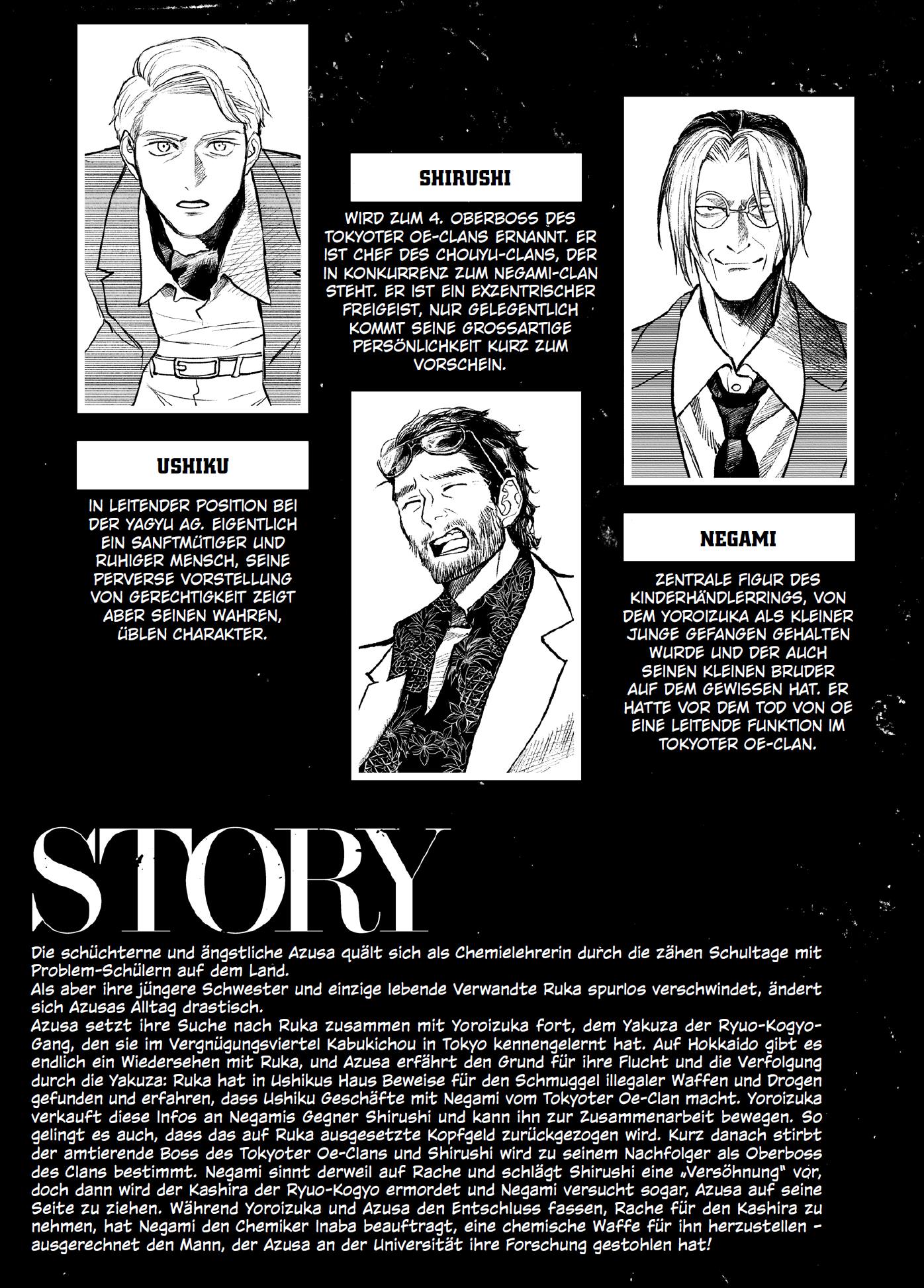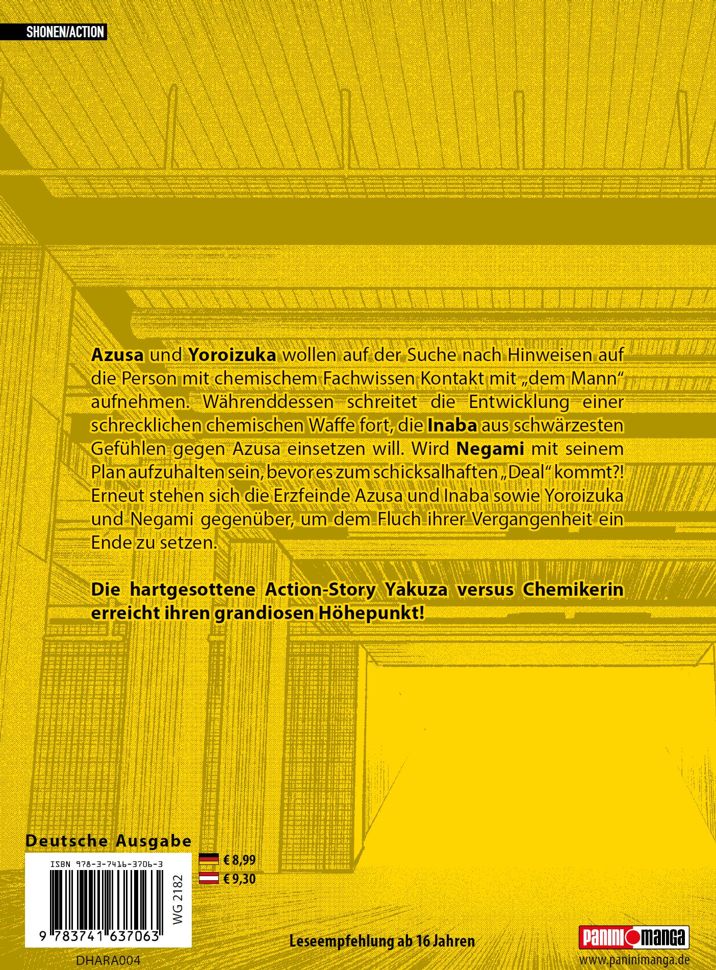 HARAHARA SENSEI ist ein actionreicher und spannender Manga mit einer explosiven Geschichte über eine Chemielehrerin und ihre gefährlichen Experimente. Folge der genialen und rachsüchtigen Azusa Tsukumo, die sich mit ihrer selbstgebauten Bombe gegen die Ungerechtigkeiten wehrt, die ihr angetan wurden. Doch sie ist nicht die einzige, die ein Geheimnis verbirgt …Das erwartet dich in Band 4:Azusa und Yoroizuka wollen auf der Suche nach Hinweisen auf die Person mit chemischem Fachwissen Kontakt mit „dem Mann“ aufnehmen. Währenddessen schreitet die Entwicklung einer schrecklichen chemischen Waffe fort, die Inaba aus schwärzesten Gefühlen gegen Azuba einsetzen will. Wird Negami mit seinem Plan aufzuhalten sein, bevor es zum schicksalhaften „Deal“ kommt?! Erneut stehen sich die Erzfeinde Azusa und Inaba sowie Yoroizuka und Negami gegenüber, um dem Fluch ihrer Vergangenheit ein Ende zu setzen.Die hartgesottene Action-Story Yakuza versus Chemikerin erreicht ihren grandiosen Höhepunkt!Für Fans von Action-, Drama- und Mystery-Manga!