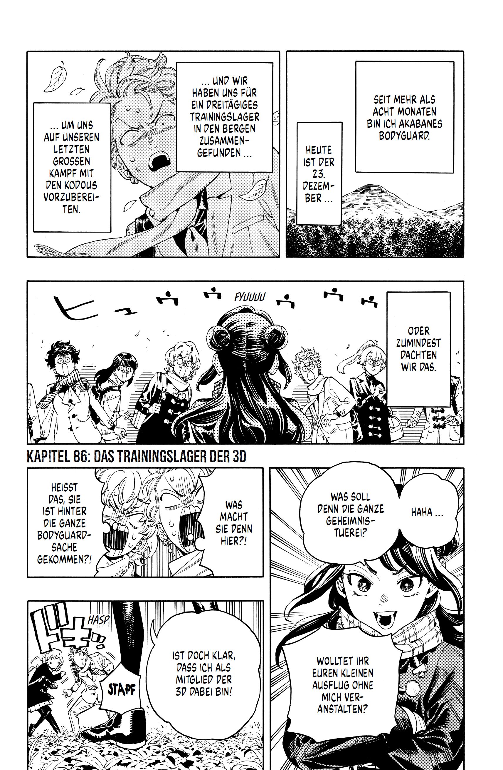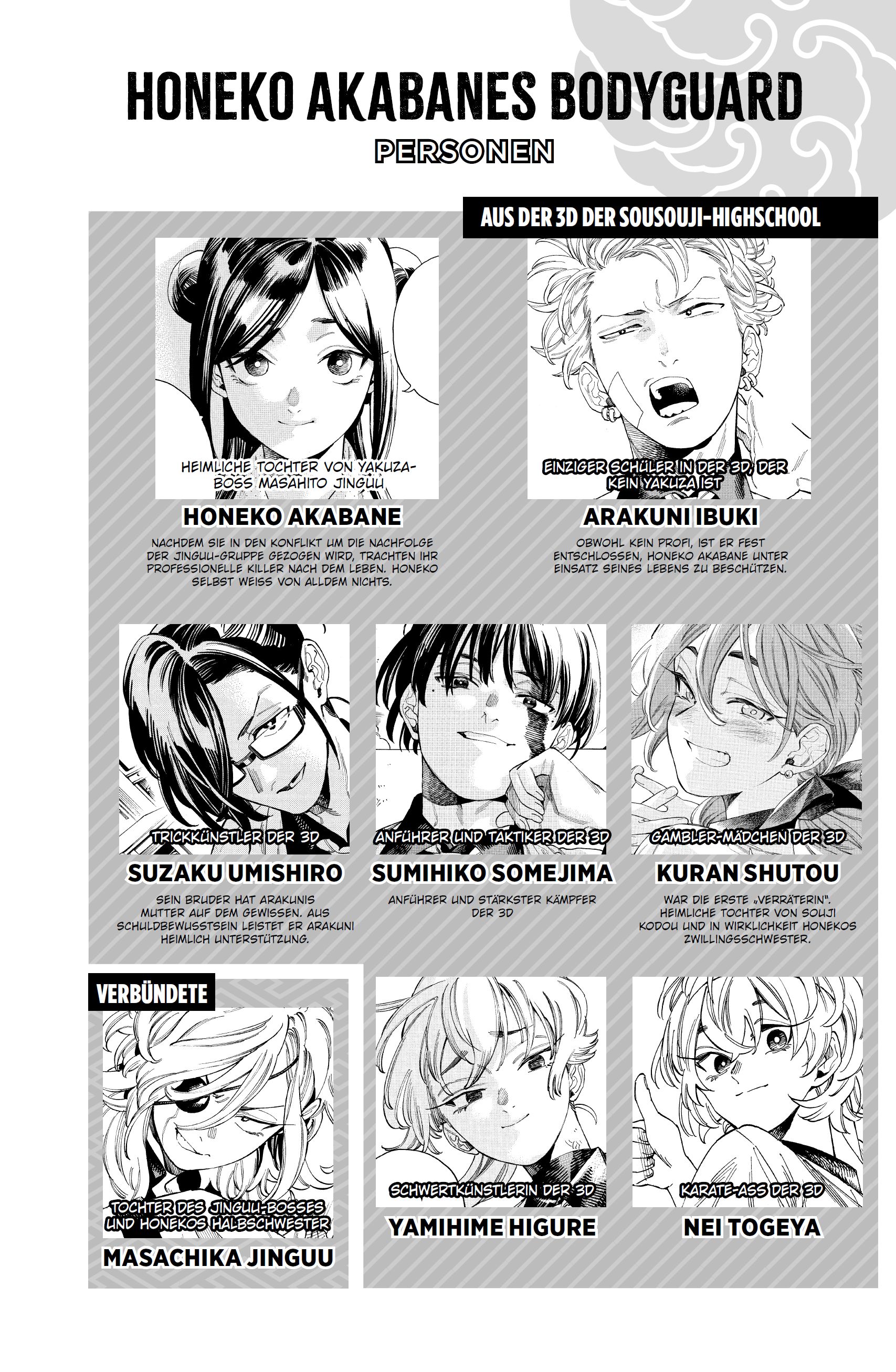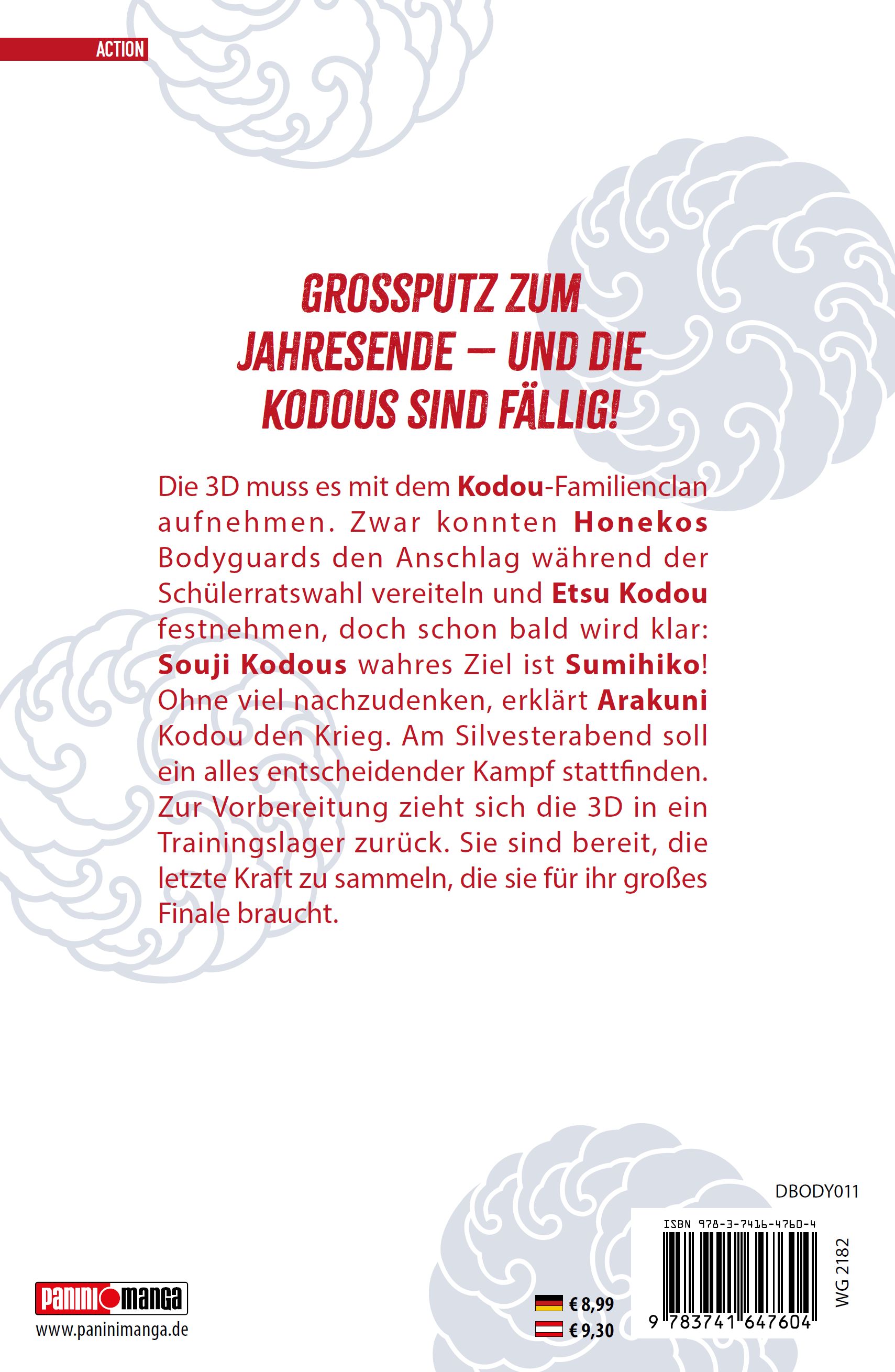 Honeko Akabanes Bodyguard vereint spannende Abenteuer, witzige Situationen und herzerwärmende Momente zu einem grandiosen Gesamtpaket! Sie haben nur ein Ziel: Den Tod von Honeko Akabane!Arakuni aus der 3D der Sousouji-Highschool traut seinen Ohren nicht, als er erfährt, dass seine Klassenkameradin Honeko das Ziel von mehreren Auftragskillern ist. Und jetzt wird ausgerechnet er von einem Gangsterboss gebeten, Honeko zu beschützen und sicherzustellen, dass sie ihr letztes Schuljahr unbeschadet übersteht. Allerdings darf Honeko von all dem nichts erfahren! Doch das ist nicht das einzige Geheimnis, das die 3D verbirgt …Für den Bodyguard in geheimer Mission beginnt ein actionreiches Schuljahr!Das erwartet dich in Band 11: GROSSPUTZ ZUM JAHRESENDE – UND DIE KODOUS SIND FÄLLIG! Die 3D muss es mit dem Kodou-Familienclan aufnehmen. Zwar konnten Honekos Bodyguards den Anschlag während der Schülerratswahl vereiteln und Etsu Kodou festnehmen, doch schon bald wird klar: Souji Kodous wahres Ziel ist Sumihiko! Ohne viel nachzudenken, erklärt Arakuni Kodou den Krieg. Am Silvesterabend soll ein alles entscheidender Kampf stattfinden. Zur Vorbereitung zieht sich die 3D in ein Trainingslager zurück. Sie sind bereit, die letzte Kraft zu sammeln, die sie für ihr großes Finale braucht.Für Fans von Action-, Abenteur-, Romance- und Comedymanga wie Assassination Classroom und Kaguya-sama: Love is war!