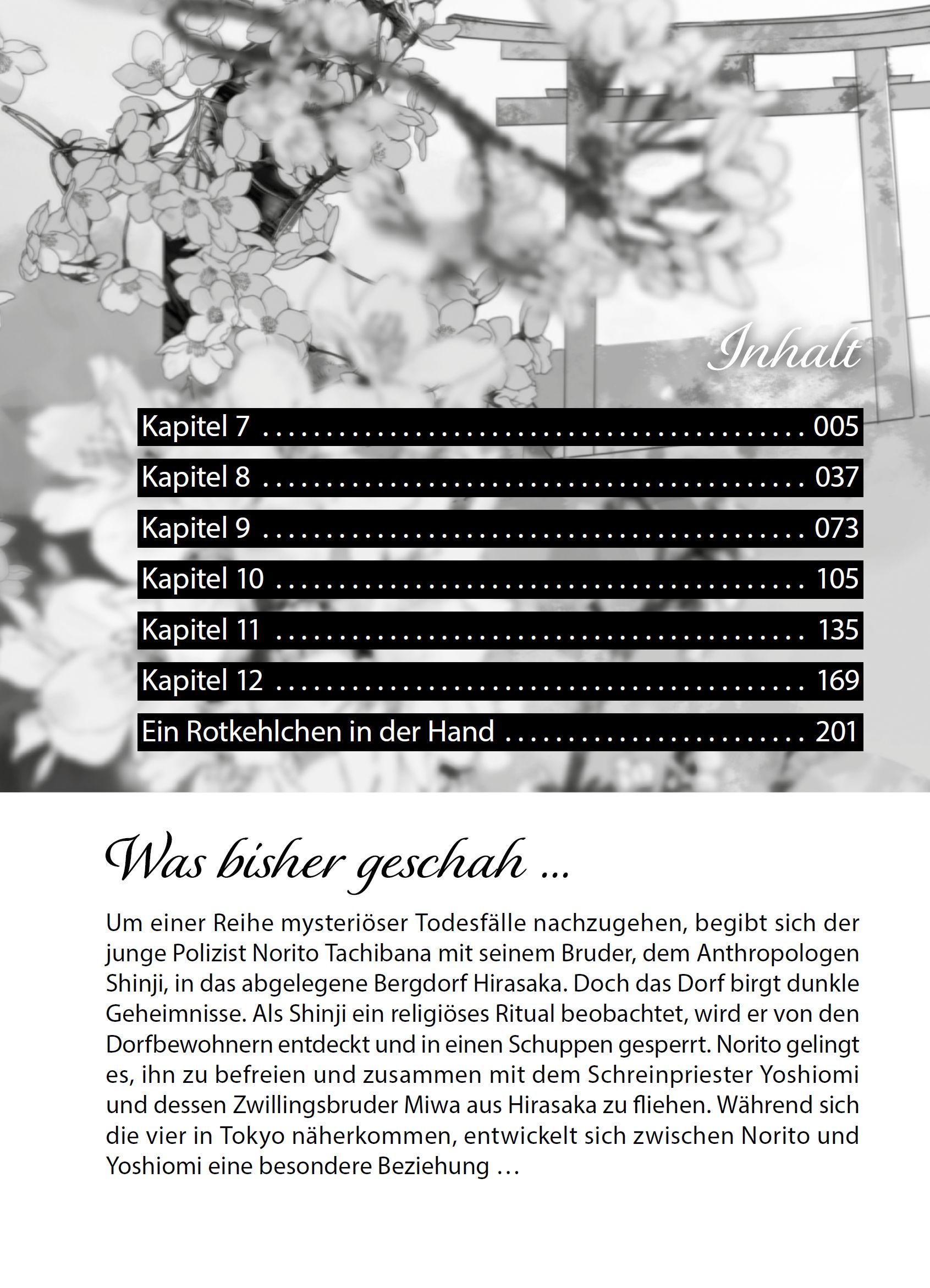 Erlebe in diesem mitreißenden Krimi-Manga, wie sich zwei Männer durch einen mysteriösen Mord näherkommen. Um einer Reihe mysteriöser Todesfälle auf die Spur zu gehen, begibt sich der junge Polizist Norito mit seinem Zwillingsbruder, dem Anthropologen Shinji, in das abgelegene Dorf Hirasaka. Dort werden sie von einem gutaussehenden Shinto-Priester namens Yoshiomi empfangen. Die zweibändige Reihe erzählt von einer Liebesgeschichte zwischen zwei Männern, deren Wege sich durch einen kuriosen Kriminalfall kreuzen.Das erwartet dich in Band 2: Als Shinji ein religiöses Ritual beobachtet, wird er von den Dorfbewohnern entdeckt und in einen Schuppen gesperrt. Norito gelingt es, ihn zu befreien und zusammen mit dem Schreinpriester Yoshiomi und dessen Zwillingsbruder Miwa aus Hirasaka nach Tokyo zu fliehen, wo Norito und Yoshiomi sich immer näher kommen … Der zweite Band wirft Licht auf das finstere Geheimnis Hirasakas.Für Fans von Mystery-, Krimi- und Boys-Love-Manga!