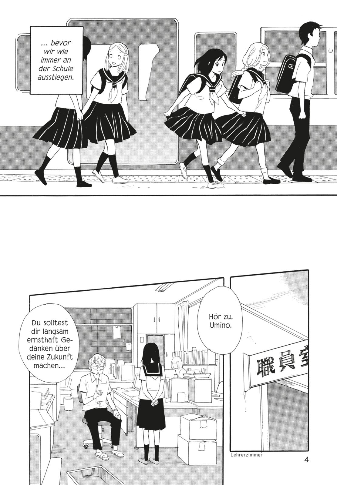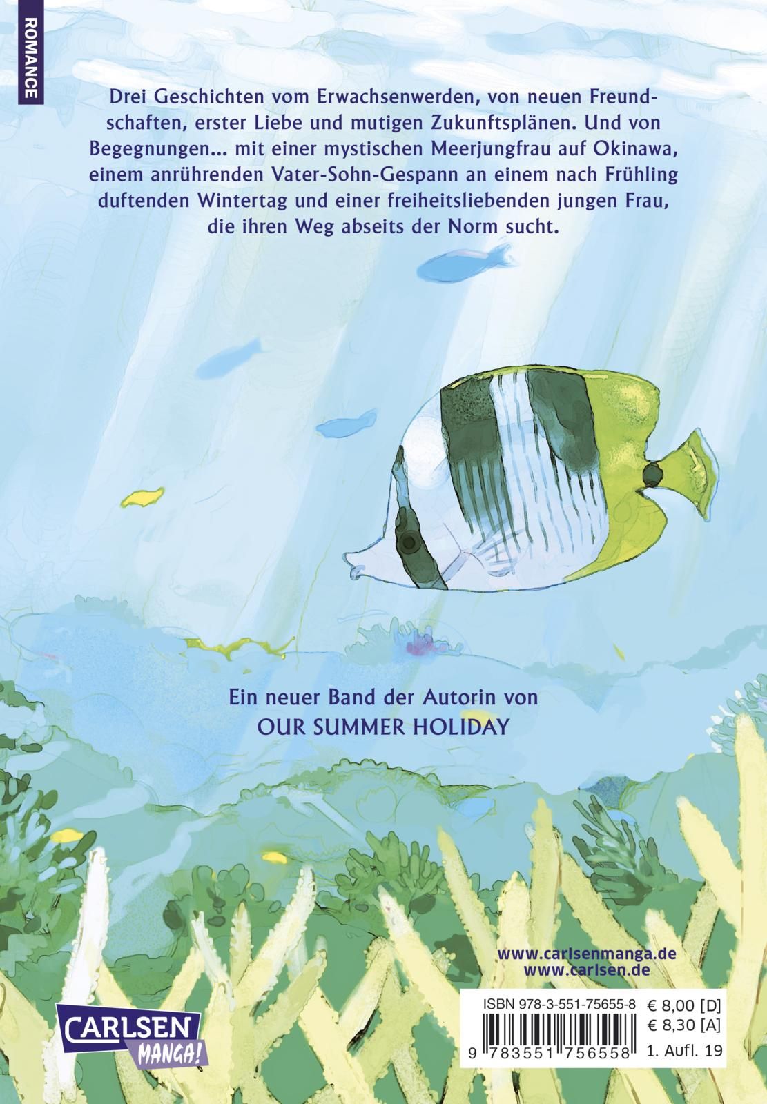 Drei Geschichten zum Erwachsenwerden: Eine in Okinawa angesiedelte Coming-of-Age-Story um einen Jungen mit einem Faible für Meerjungfrauen. Eine weitere dreht sich um einen obdachlosen Vater mit seinem Sohn, der Schnee und Kälte Zuflucht in einer Bücherei sucht, den Abschluss bildet eine Freundschaftgeschichte um zwei Mädchen. Wie auch schon in OUR SUMMER HOLIDAY gelingt es Kaori Ozaki, junge Charaktere beim Erwachsenwerden sehr einfühlsam aufs Papier zu bannen.
