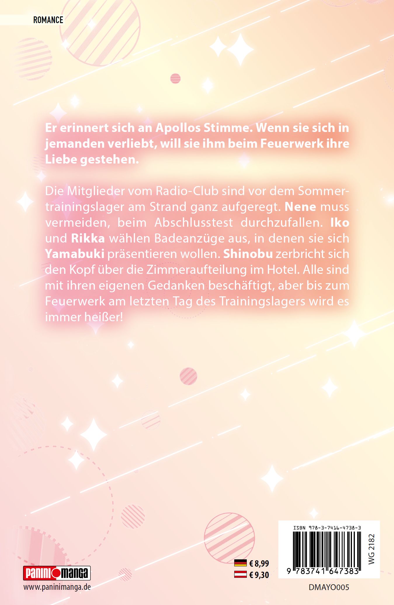 In diesem RomCom-Hit sucht ein Highschool-Schüler nach einer geheimnisvollen Radiomoderatorin und stößt dabei auf vier Mädchen, deren Träume er zuerst erfüllen muss!„Mitten in der Nacht auf dem Bett war deine Stimme meine einzige Rettung. Ich möchte noch einmal mit dir reden. Ich habe dir etwas zu sagen.“Arisu Yamabuki, ein Highschool-Schüler im zweiten Jahr, sucht nach einer Radiomoderatorin namens Apollo, deren Gesicht und echten Namen er aber nicht kennt. Jedoch stösst er unverhofft bei dem Radioclub der Mädchenschule, mit der seine eigene Schule sich zusammengeschlossen hat, auf einen Hinweis. Dort sind mehrere Schülerinnen, die davon träumen, einen Beruf auszuüben, der sich um ihre Stimmen dreht. Es sind gleich vier! Um Apollo finden zu können, gelobt Arisu die Träume der vier zu erfüllen!Doch wer ist Apollo? Was wird aus den Träumen der vier? Dies ist der Beginn einer niedlichen und gleichzeitig eifrigen Erfolgs-RomCom! Das erwartet dich in Band 5: Er erinnert sich an Apollos Stimme. Wenn sie sich in jemanden verliebt, will sie ihm beim Feuerwerk ihre Liebe gestehen. Die Mitglieder vom Radio-Club sind vor dem Sommertrainingslager am Strand ganz aufgeregt. Nene muss vermeiden, beim Abschlusstest durchzufallen. Iko und Rikka wählen Badeanzüge aus, in denen sie sich Yamabuki präsentieren wollen. Shinobu zerbricht sich den Kopf über die Zimmeraufteilung im Hotel. Alle sind mit ihren eigenen Gedanken beschäftigt, aber bis zum Feuerwerk am letzten Tag des Trainingslagers wird es immer heißer!Egal ob im Sonnenschein oder im Sternenlicht – die Jugend und die Liebe der Mädchen strahlen in dieser Erfolgs-Romcom!Für Fans von The Quintessential Quintuplets und More than a Doll/My Dress-Up Darling!