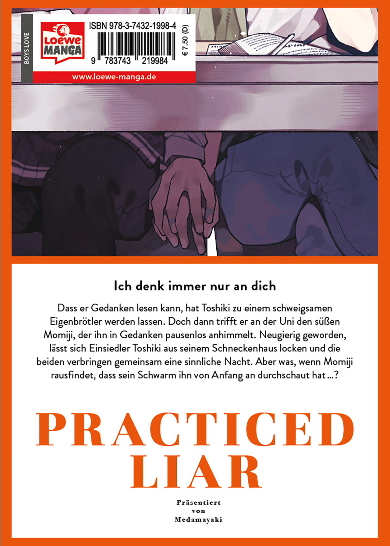 Practiced Liar ist eine süße, romantische Liebesgeschichte zwischen zwei eigenbrötlerischen Universitätsstudenten. Ein witziger Boys-Love-Manga über das Gedankenlesen und Wahrnehmen ungefilterter Gefühle . Für Fans von Was sich neckt, das liebt s ich und Cherry Magic!