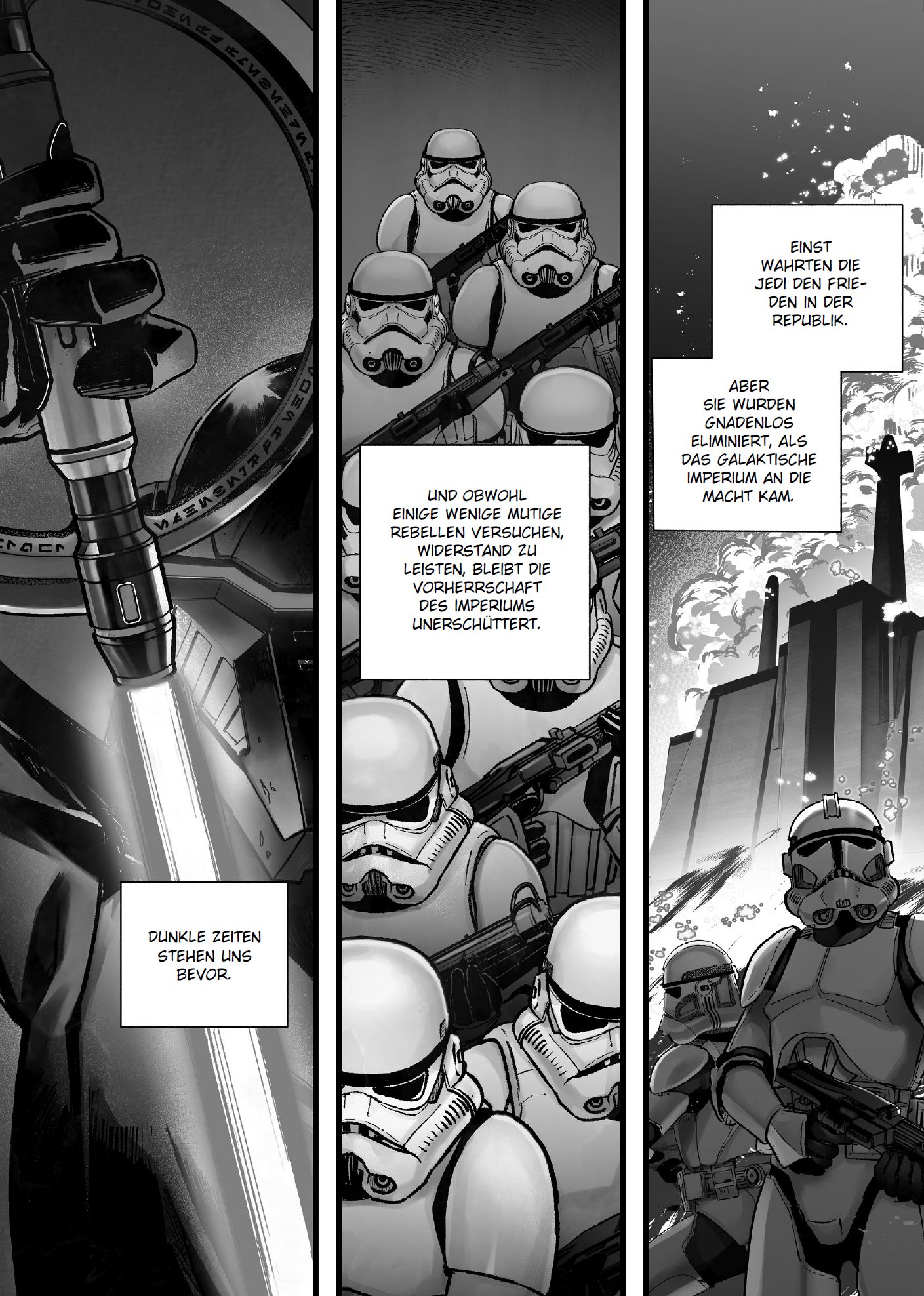 Westliche Leserichtung, d.h. von links nach rechtsmit Sammelpostkarte in ErstauflageBasierend auf dem Videospiel von Respawn Entertainment, entwickelt in Zusammenarbeit mit Lucasfilm Games
