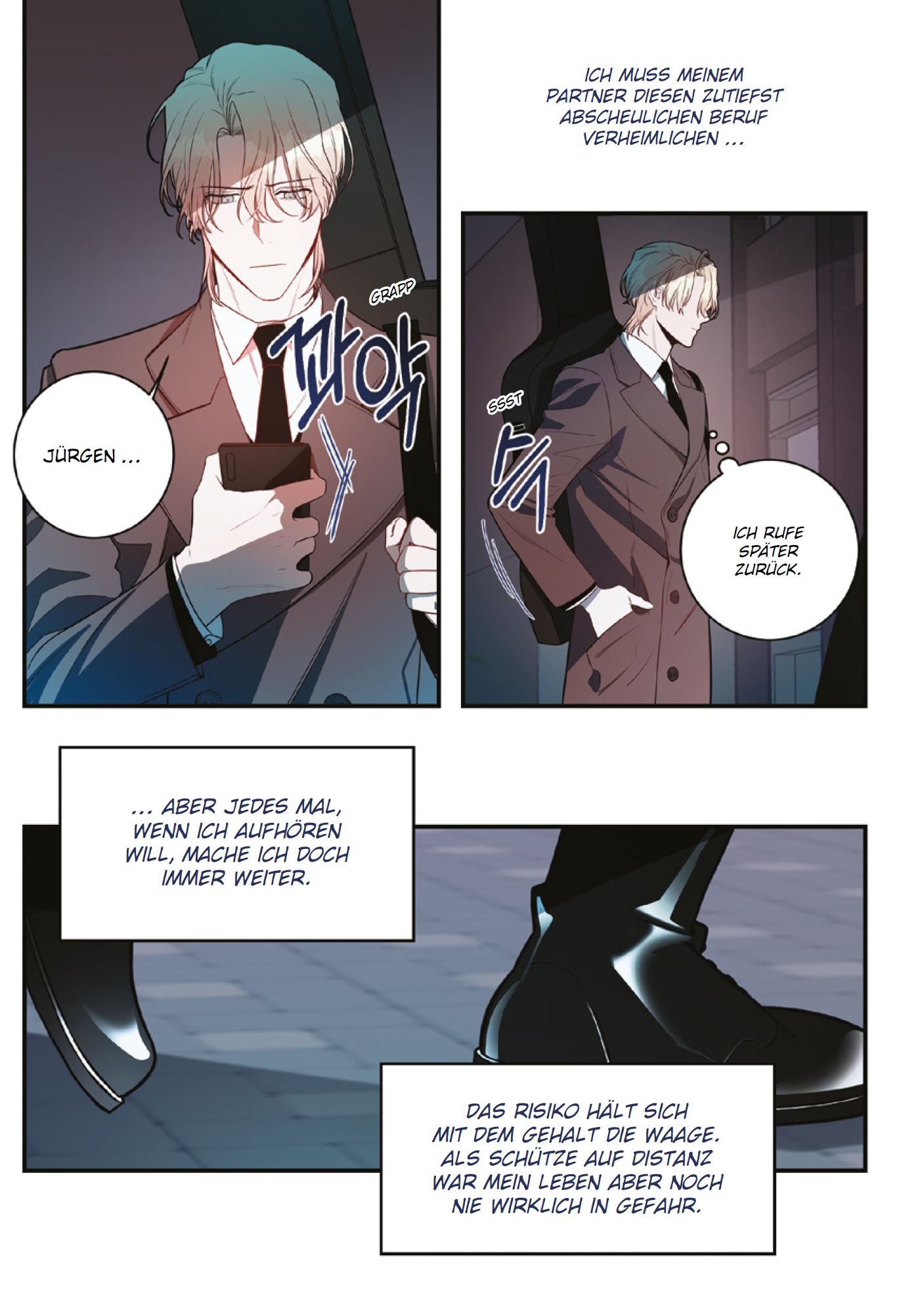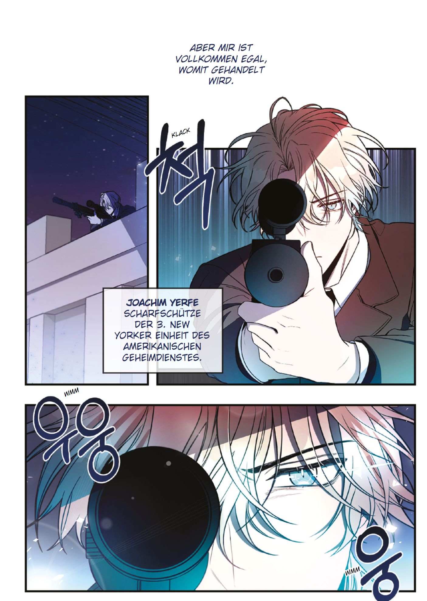 Ein düster-romantischer BL-Thriller mit übernatürlichen Elementen.Joachim hat ein tödliches Geheimnis: Er ist Scharfschütze bei einem Geheimdienst, dessen Agenten besondere Fähigkeiten besitzen. Jede seiner Missionen wird perfekt ausgeführt und doch könnte Joachim seinen Beruf nicht mehr hassen! Andauernd träumt er davon, endlich die Kündigung einzureichen und seinen gefährlichen Alltag gegen ein Leben voller Frieden und Freude an der Seite seines Partners Jürgen einzutauschen. Aber das ist leichter gesagt als getan. Als eine von Joachims Missionen schließlich fehlschlägt, nimmt er sich vor, Jürgen um jeden Preis zu beschützen – selbst, wenn er dafür ihre Beziehung beenden und untertauchen muss. Allerdings hat er diese Rechnung ohne Jürgen gemacht.Für BL- und Fantasyfans!Empfohlen ab 18!