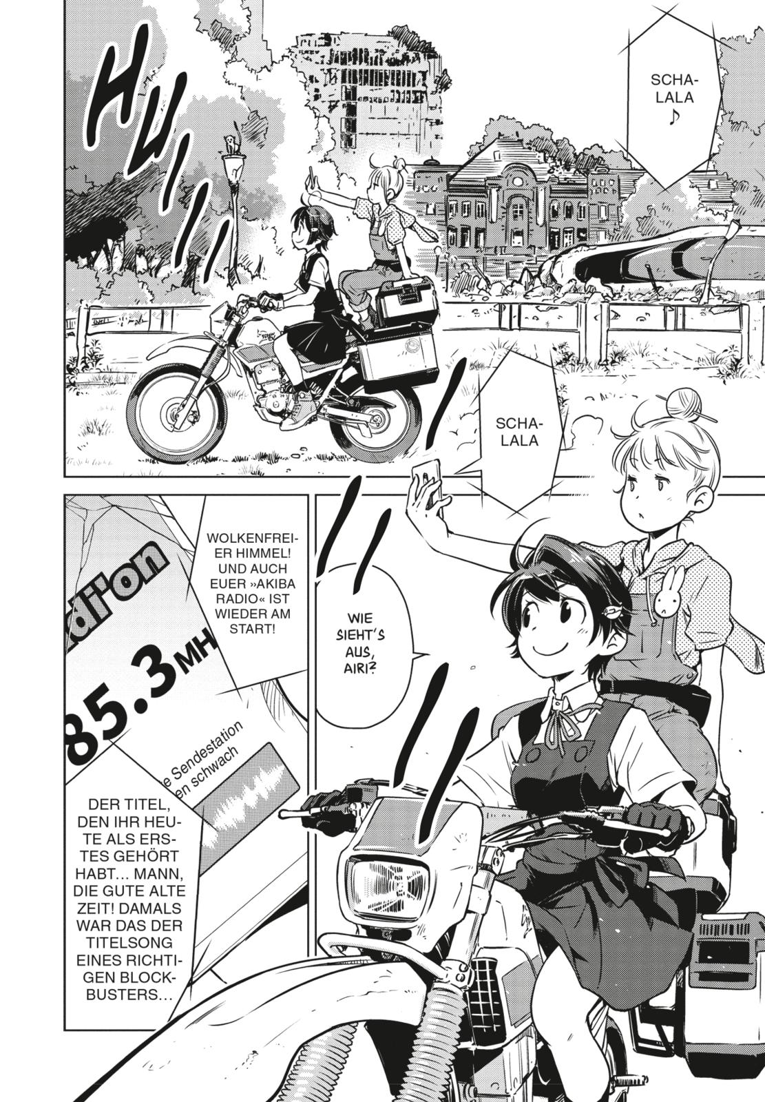 Zwei Freundinnen sind mit einer Yamaha auf Tour durch ein apokalyptisches Japan. Das Endzeit-Sightseeing ist aber ganz anders, als man dies auf den ersten Blick erwarten würde… überraschend ausgelassen touren die beiden Frauen durch Ruinen und zerstörte Landschaften.